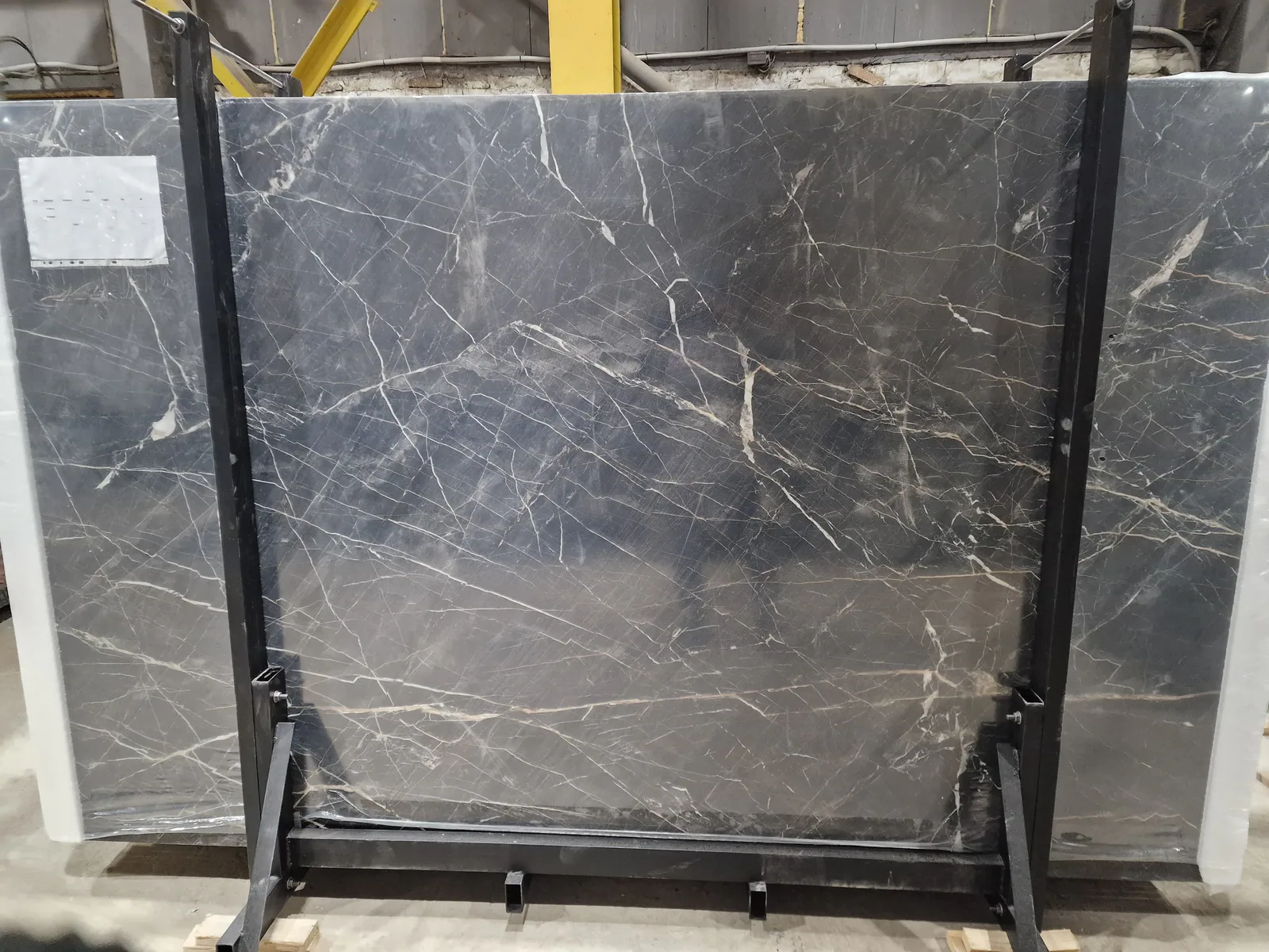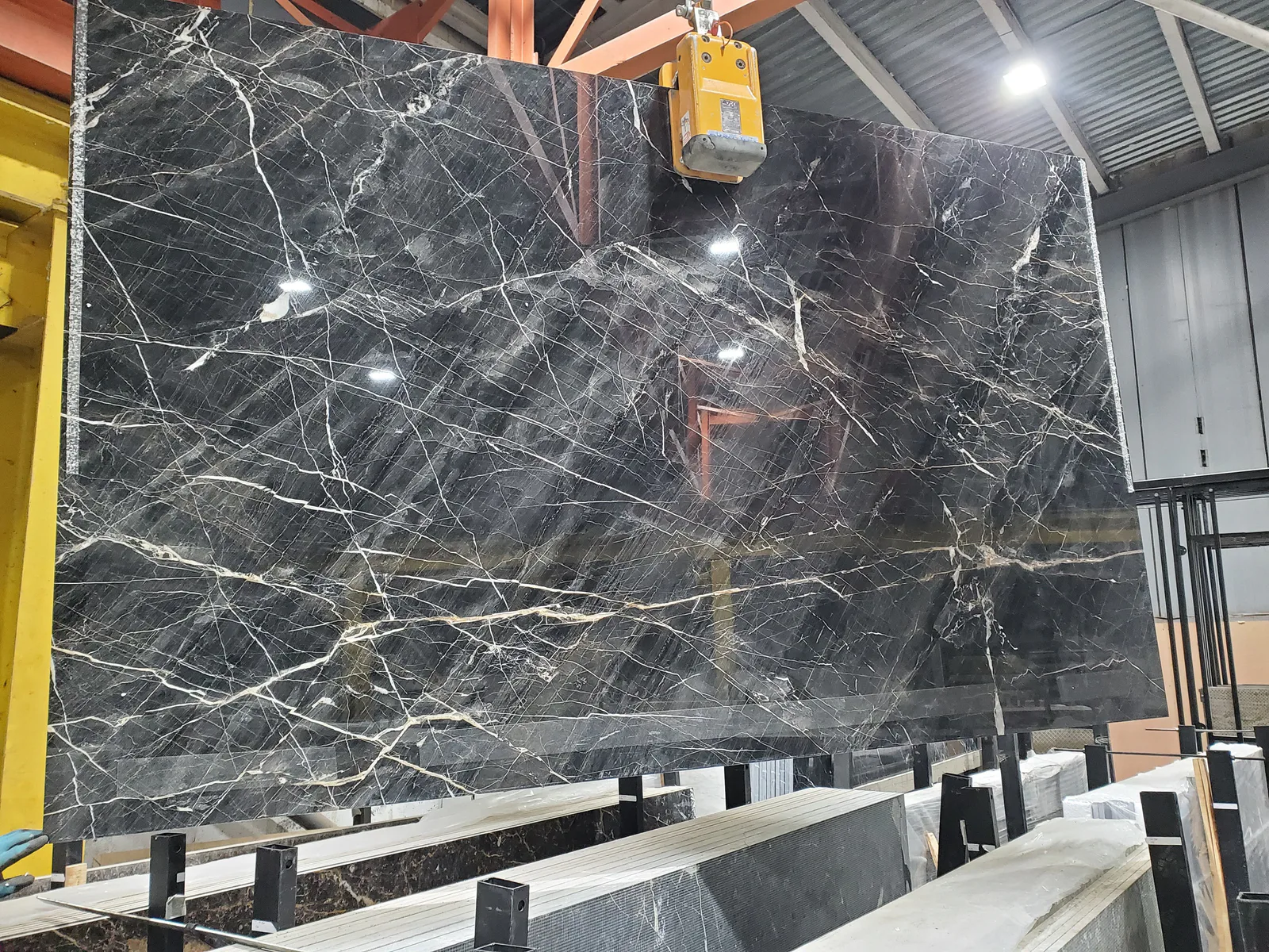 МраморНовая партия 3D Black. Тот же карьер, но рисунок каждого слэба неповторим. Чёрный фон, белые прожилки с эффектом объёма.