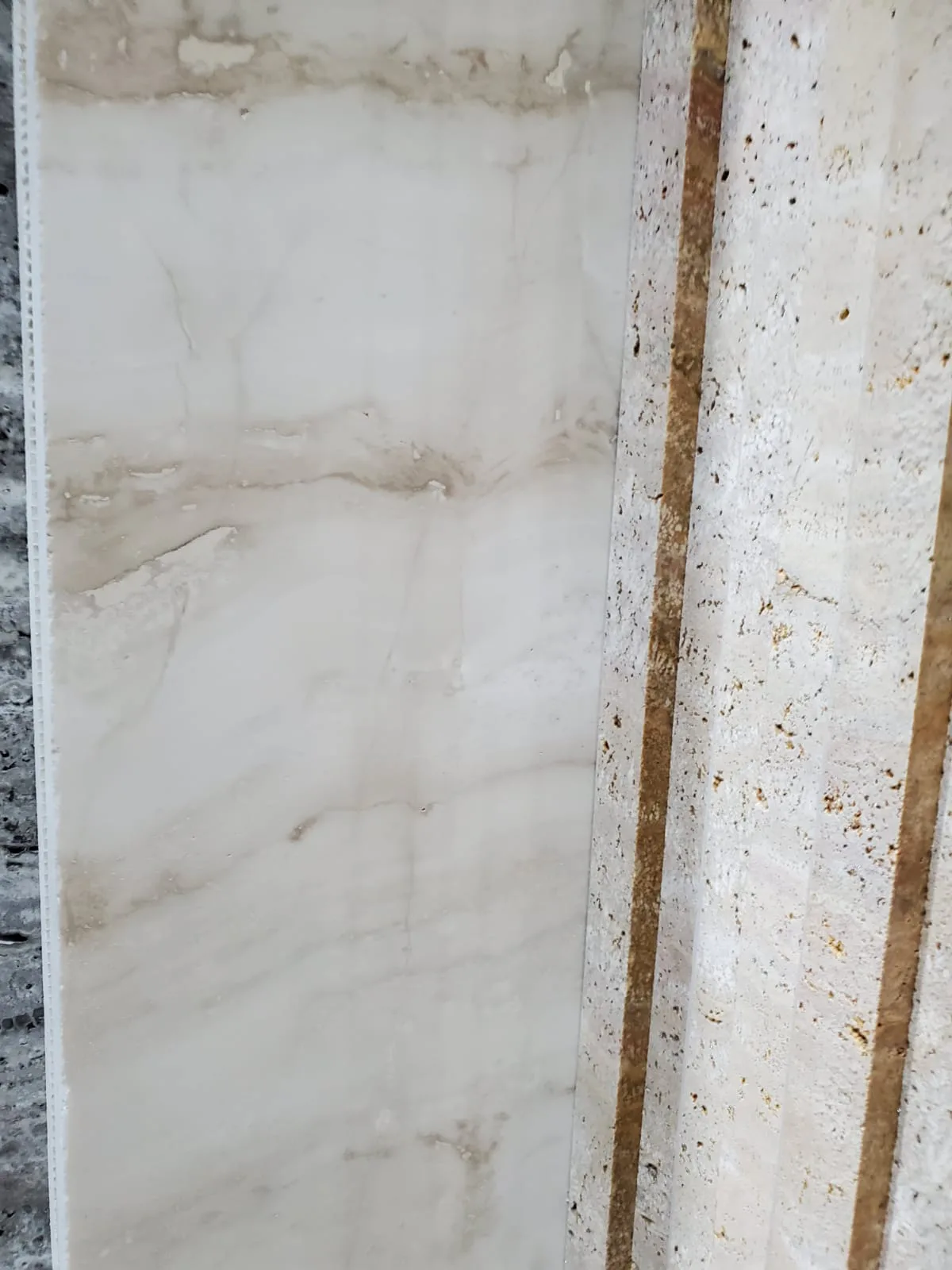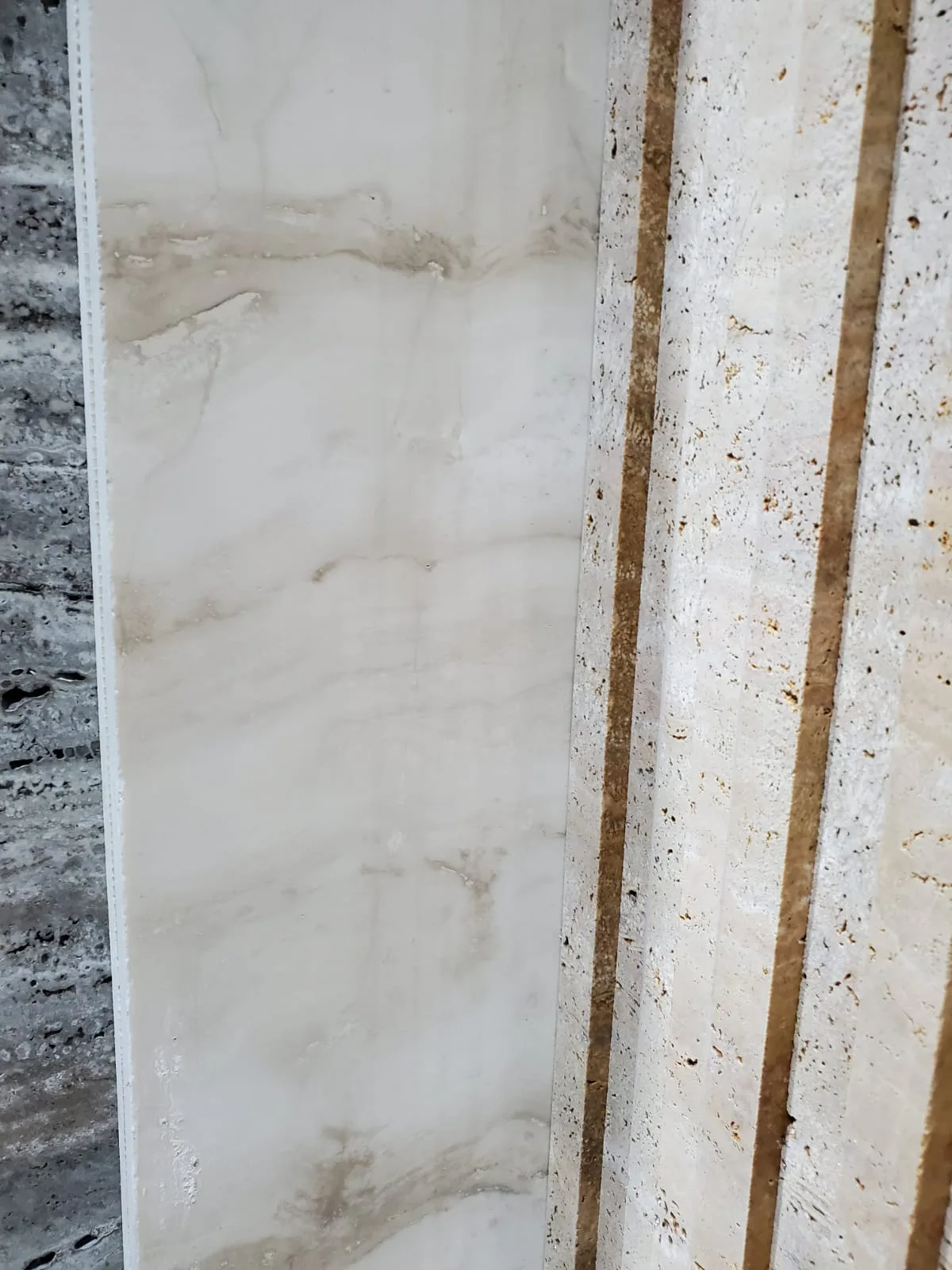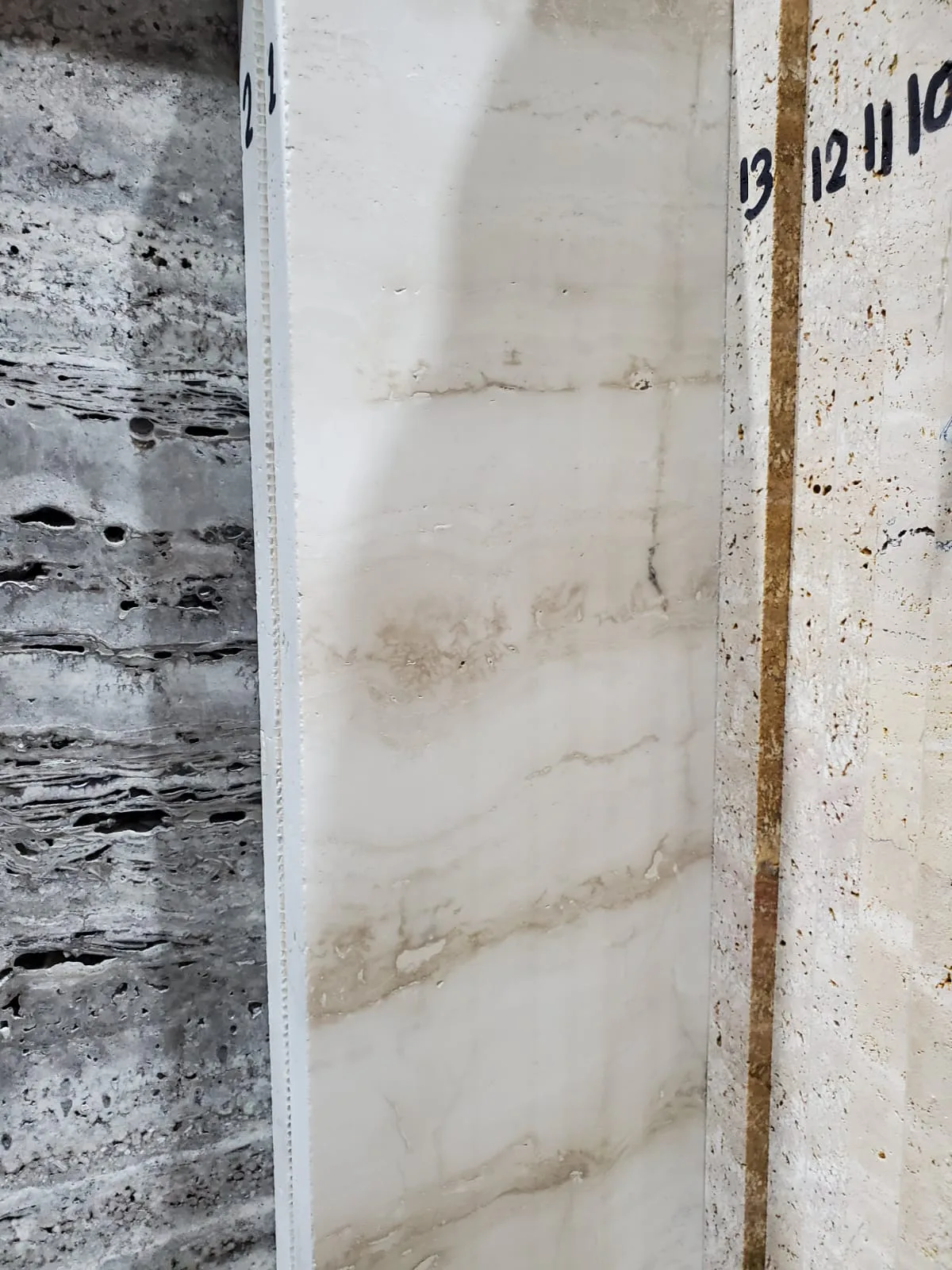 Белый травертин — это не белый мрамор. Текстура пор всё равно читается даже через заполнение — камень живой.