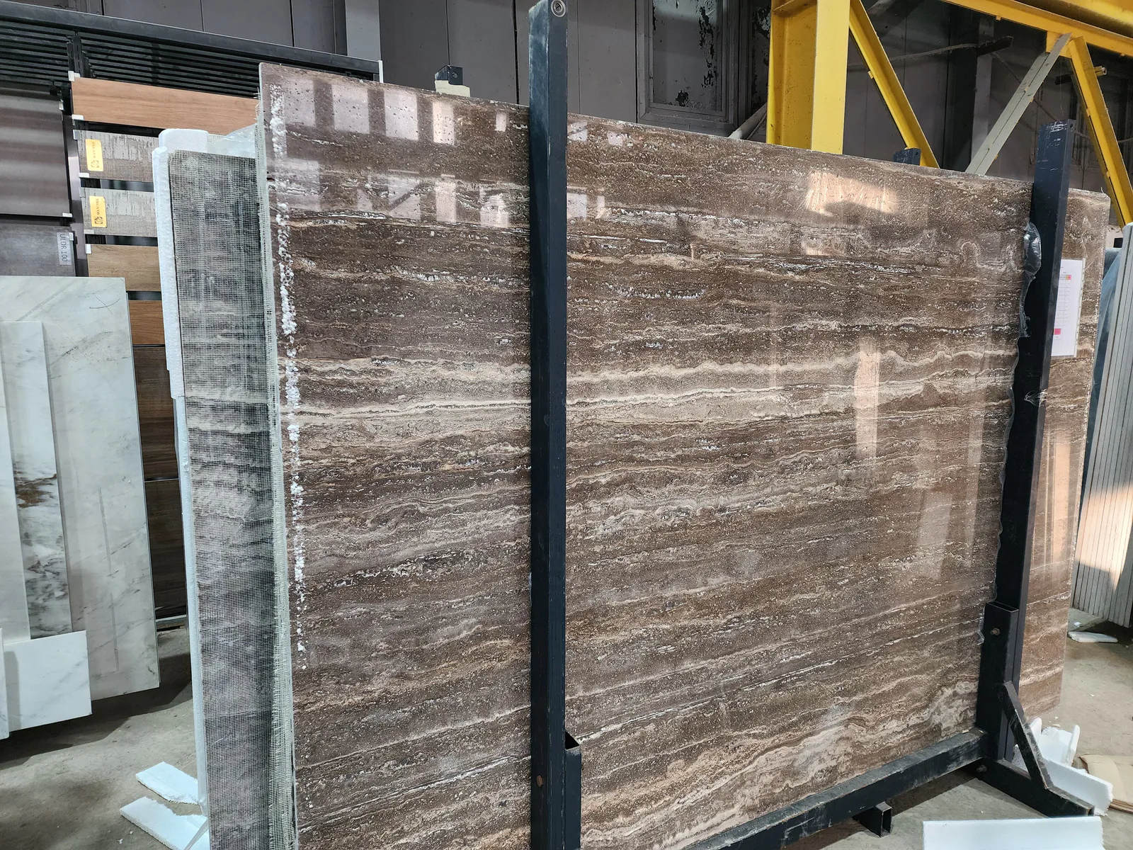 ТравертинФиниковый травертин (Khormaei) — тёплый, коричневато-бежевый с характерным «сладким» оттенком. Заполненный, полированный — гладкий и удобный в уходе.