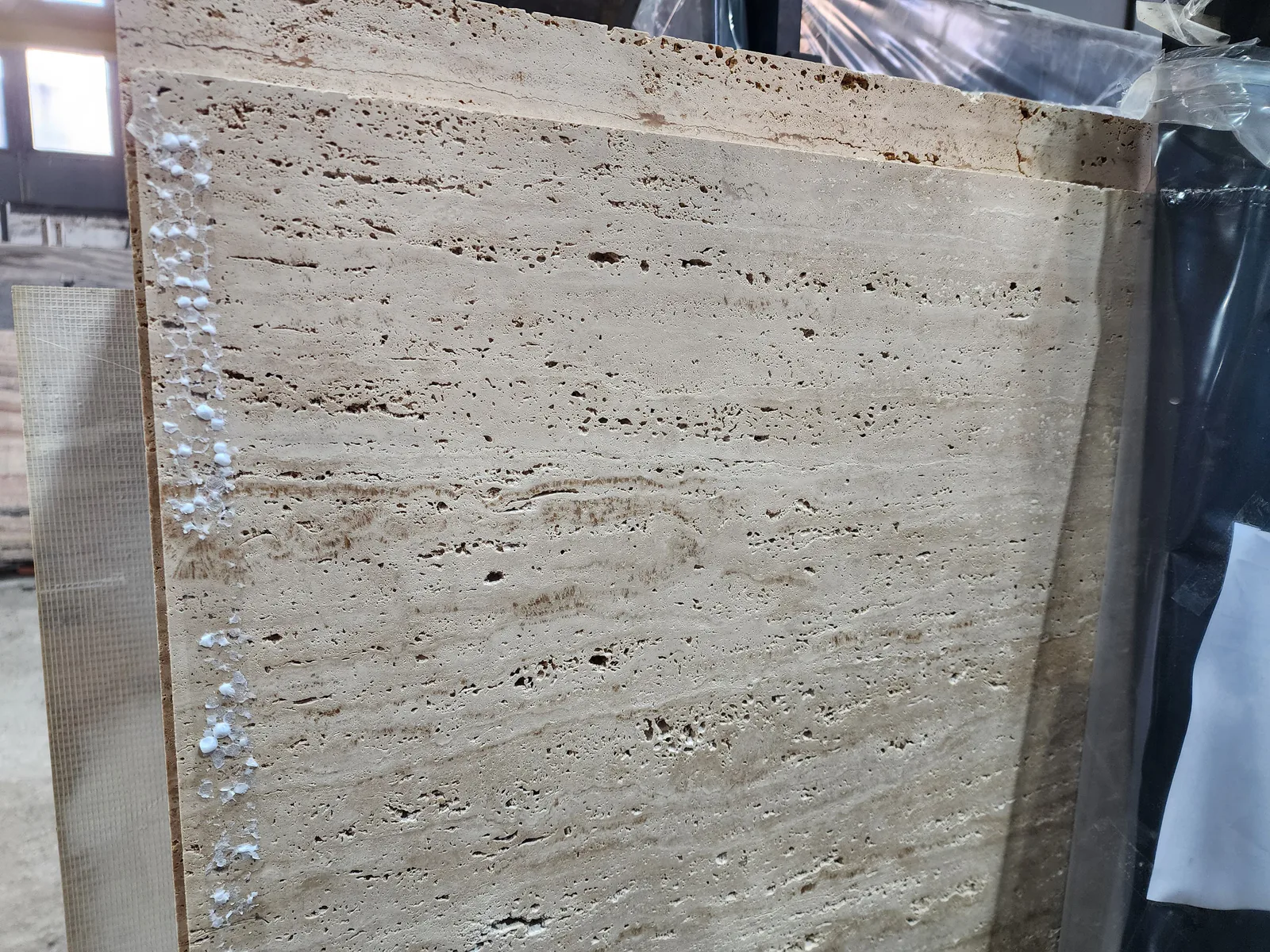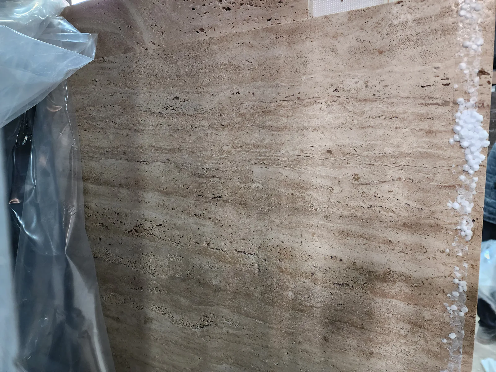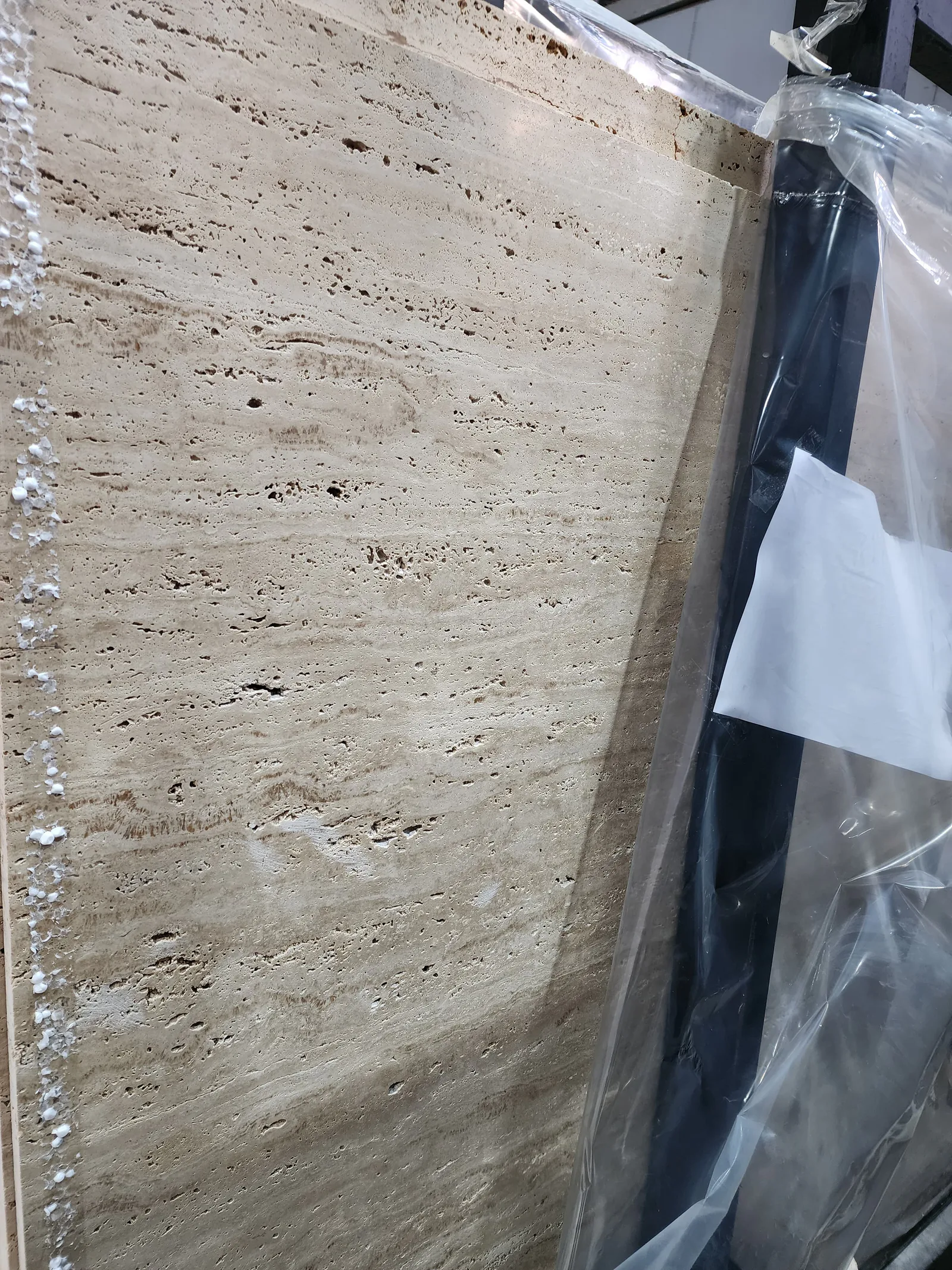 ТравертинСветлый кремовый травертин, вейнкат (нарезан поперёк волокон). Незаполненный — с характерными открытыми порами и природной фактурой.